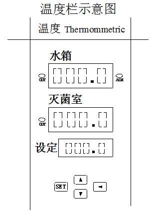 在溫度欄里共有三組數(shù)字屏,上面一組數(shù)字為水箱的測溫值;中間一組數(shù)字為滅菌室的測定溫度值,隨著加溫這兩組數(shù)字值會逐步上升。下面一組數(shù)字屏為溫度設(shè)定值,只有進入設(shè)定狀態(tài)時才可以改變其參數(shù)。這三組數(shù)字屏顯示的數(shù)字前三位是整數(shù),后一位是小數(shù),在個位數(shù)后有小數(shù)點。