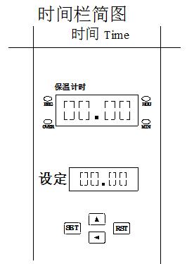 時間欄里有兩組數(shù)字屏,上面組是計時屏,下面組是設(shè)置屏,顯示設(shè)定的時間值。計時屏在溫度沒有達到計時點不計時,四個數(shù)字顯示為“00.00”。時間屏和設(shè)置屏前兩位為整數(shù),后兩位為小數(shù),中間有小數(shù)點。時間單位可以設(shè)定為“分鐘”也可以設(shè)定為“小時”。