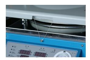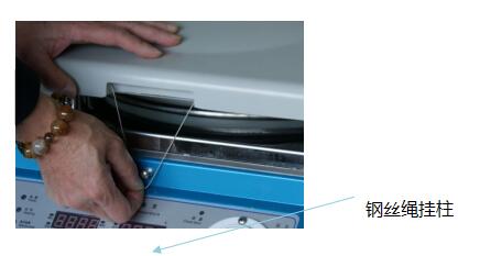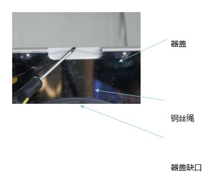 到達開蓋的溫度后,用左手扶壓住機蓋,右手手指拉出器蓋正前方缺口內(nèi)的鋼絲繩。(見圖一)