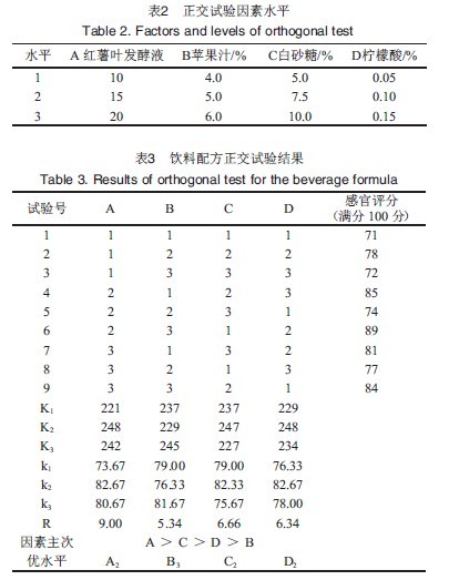 由極差分析(表3)可知,對飲料風味的影響因素順序為A>C>D>B,紅薯葉發酵液是影響飲料的重要因素。